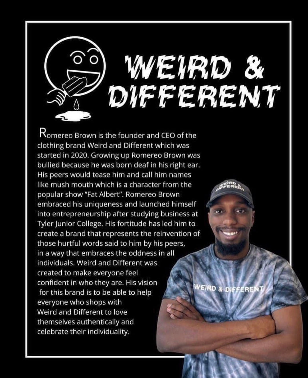 Romereo Brown Jr is the founder and CEO of the clothing brand Weird and Different which was started in 2020. Growing up Romero Brown was bullied because he was born deaf in his right ear. His peers would tease him and call him names like mush mouth which is a character from the popular show "Fat Albert". Romereo embraced his uniqueness and launched himself into entrepreneurshipafter studying business at Tyler Junior College. His fortitude has led him to create a brand that represents the reinvention of those hurtful words said to him by his peers, in a way that embraces the oddness in all individuals. Weird and Different was created to make everyone feel confident in who they are. His vision for this brand is to be able to help evervone who shops with Weird and Different to love themselves authentically and celebrate their individuality.